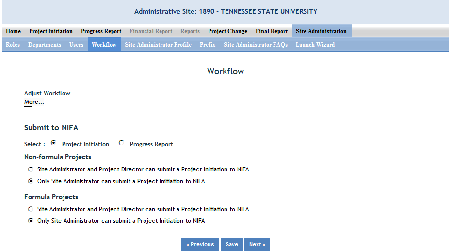 The workflow rules and permission for submitting a progress report are identical to how Project Initiations are submitted at the institution level and then at the NIFA level. For detailed instructions on the submission process, go to How to Submit a Project in the Project Initiation section of this manual.