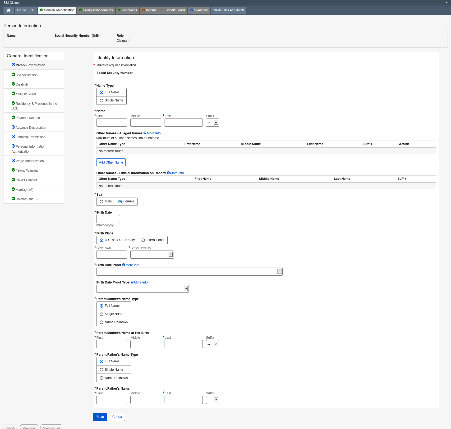 This page collects and/or displays information regarding the type of Social Security being alleged or received and the amount. It is updated by the user, iClaim and the Master Beneficiary Record (MBR) interface with SSI systems.