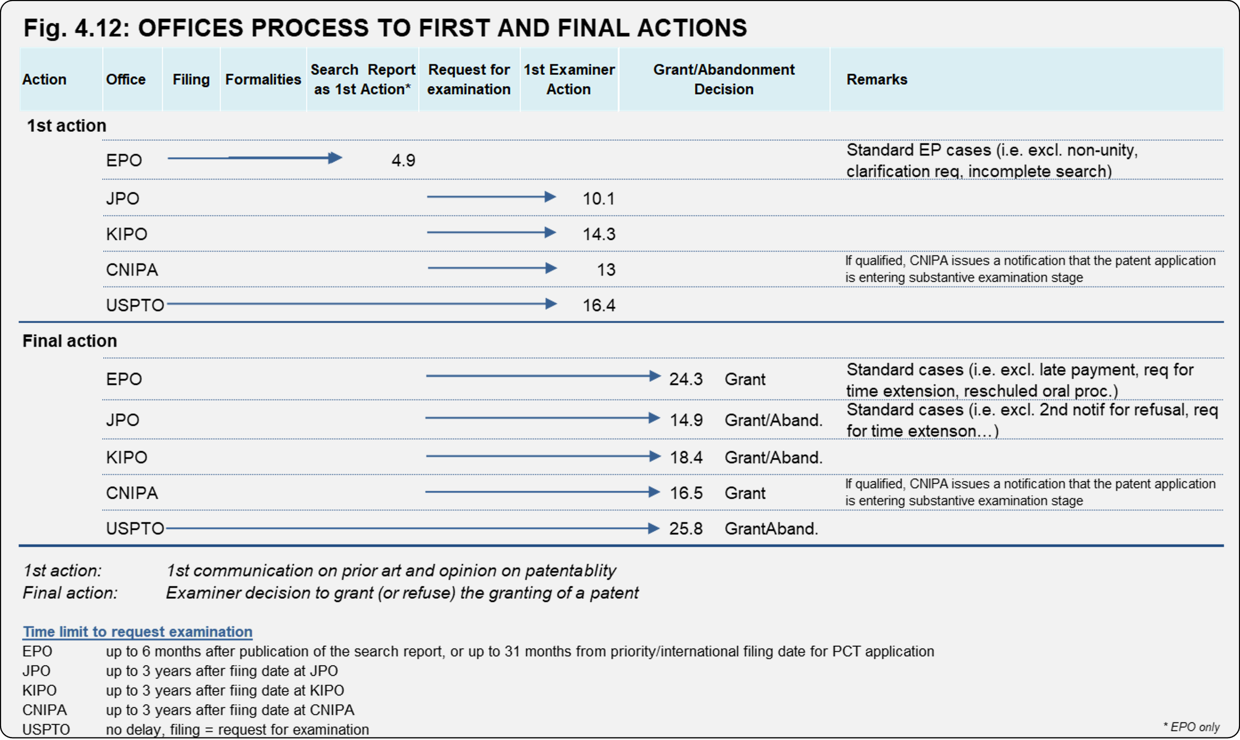 各 IP5 官庁では、次の事項に到達するまでに平均でどれくらいの時間がかかるかが明らかです: (マトリックス形式の質問: 列に沿って官庁が表示されます: EPO、JPO、KIPO、CNIPA、USPTO。該当するものをすべて選択してください)