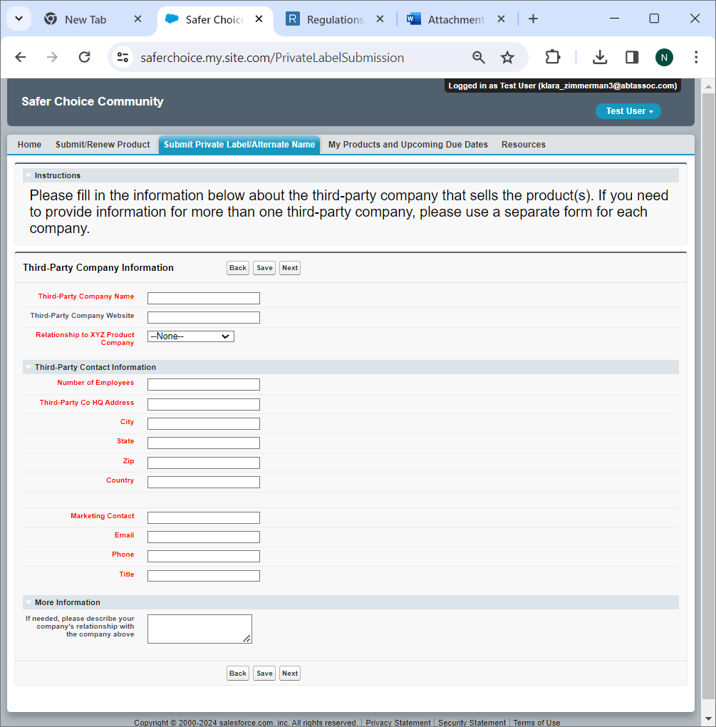 Following are screenshots from the Private Label Submission form in the Safer Choice Community cloud-based Salesforce data system. Please refer to Section 12b, IC#1 for a full list of data items collected. Note that the specific details of the screenshots may change over time as the Safer Choice program improves and/or modifies the system. However, the general and fundamental components of the cloud-based Salesforce system will be similar to what is presented in the following screenshots.