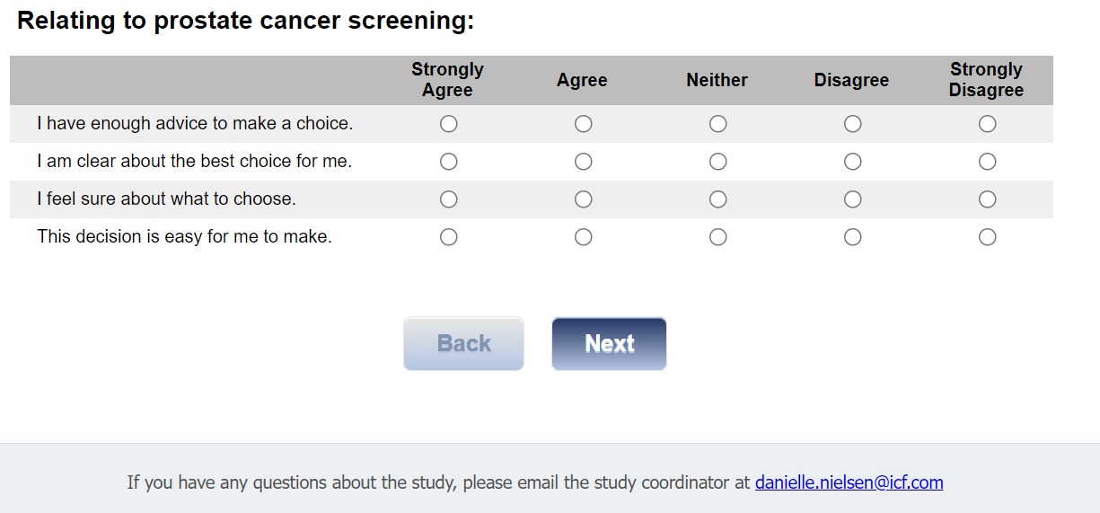 As it relates to prostate cancer screening, for this next set of questions, please indicate your agreement with each statement, using either strongly agree, agree, neither, disagree, or strongly disagree.