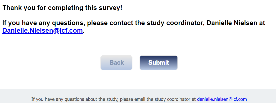Survey Completion text: Thank you for completing this survey. If you have additional questions about the study, please email the study coordinator at danielle.nielsen@icf.com |