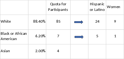 Figure 2 shows the quotas for Study 1 and Study 2. From this figure it can be seen that for Study 1, researchers will try to recruit 68 participants who are White; 6 that are Black or African American, and 2 that are Asian. Furthermore, among the 68 White participants, 20 should be Hispanic or Latino, and 7 should be women. Similarly, of the 6 Black or African American participants, 3 should be Hispanic or Latino and 1 should be a Woman. Similarly, for Study 2, the goal of researchers is to recruit 85 participants who are White, 7 participants who are Black or African American, and 4 participants who are Asian. Furthermore, among the 85 White participants, 24 should be Hispanic or Latino, and 9 should be Women; on the same token, among the 7 Black or African American participants, 5 should be Hispanic or Latino, and 1 should be a Woman.
