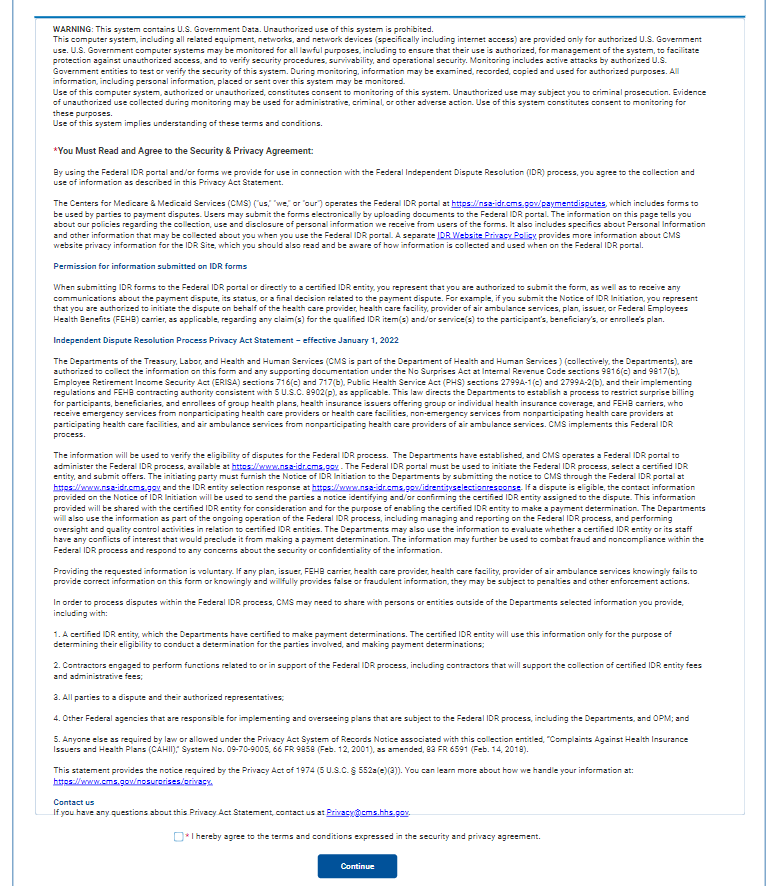 By using the Federal IDR portal and/or forms we provide for use in connection with the Federal Independent Dispute Resolution (IDR) process, you agree to the collection and use of information as described in this Privacy Act Statement.