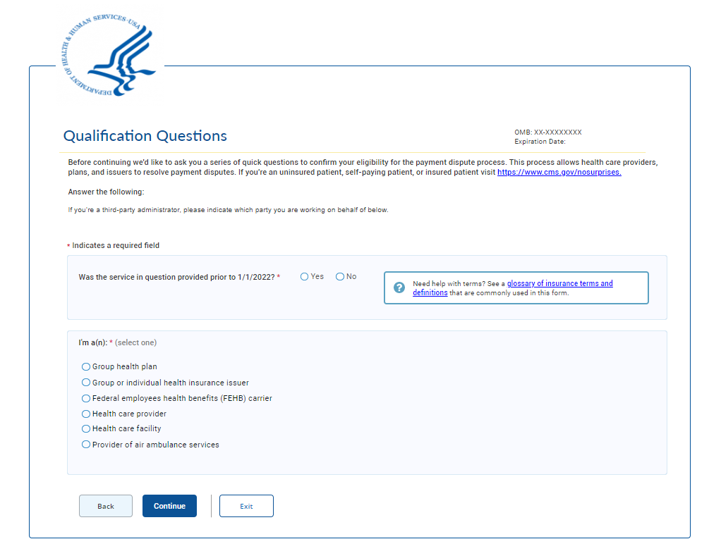 Before continuing we'd like to ask you a series of quick questions to confirm your eligibility for the payment dispute process. This process allows health care providers, plans, and issuers to resolve payment disputes. If you're an uninsured patient, self-paying patient, or insured patient visit https://www.cms.gov/nosurprises.
