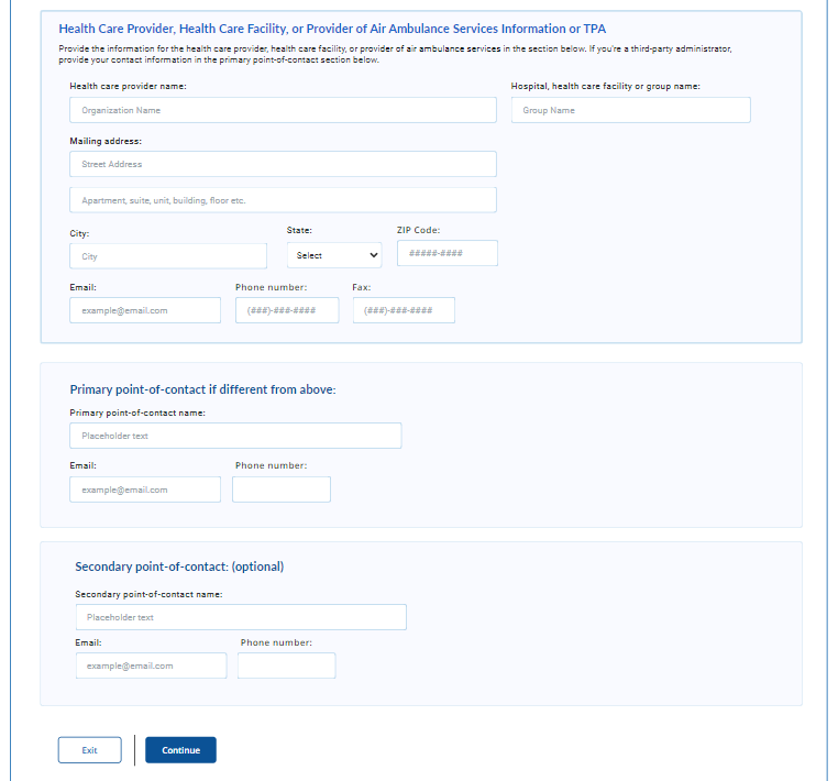 Provide the information for the health care provider, health care facility, or provider of air ambulance services in the section below. If you’re a third-party administrator, provide your contact information in the primary point-of-contact section below.