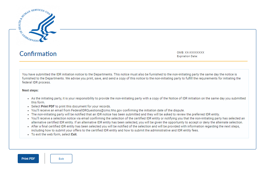 The Centers for Medicare & Medicaid Services (CMS) ("us," "we," or "our") operates the Federal IDR portal including forms used by parties to payment disputes available on https://nsa-idr.cms.gov/paymentdisputes. Users may submit the forms electronically by uploading documents to the Federal IDR portal. The information on this page tells you about our policies regarding the collection, use and disclosure of personal information we receive from users of the form. It also includes specifics about Personal Information and other information that may be collected about you when you use the Federal IDR portal. A separate IDR Website Privacy Policy provides more information about CMS website privacy information for the IDR Site, which you should also read and be aware of how information is collected and used when on the Federal IDR portal.