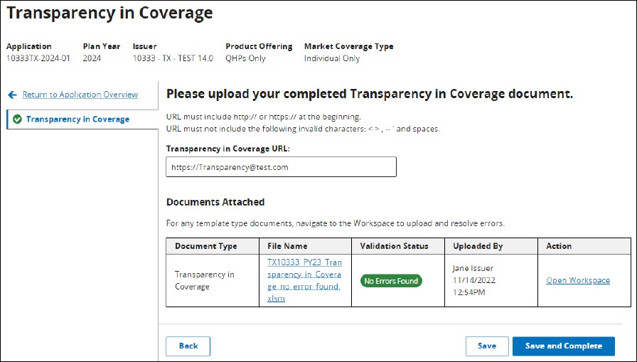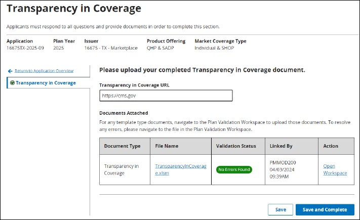 The Transparency in Coverage Section is required as part of all QHP Applications and requires the user to link a Transparency in Coverage template XML to their application, as well as provide a Transparency in Coverage URL.