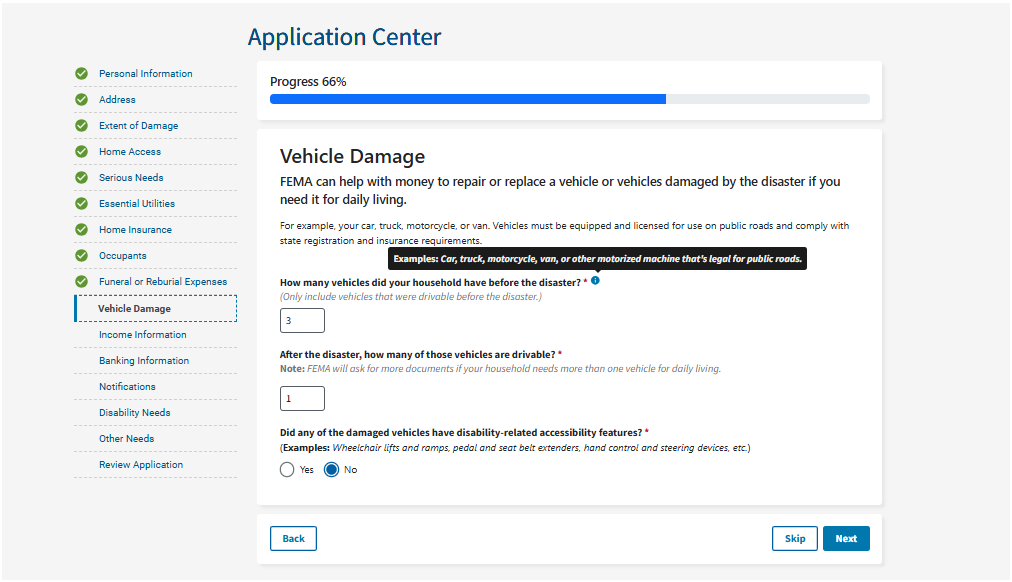Vehicles, like your car, truck, motorcycle, or van, must be equipped and licensed for use on public roads. They must also comply with state registration and insurance requirements. FEMA may ask for a copy of your mechanic receipts or estimates for your damaged vehicle.