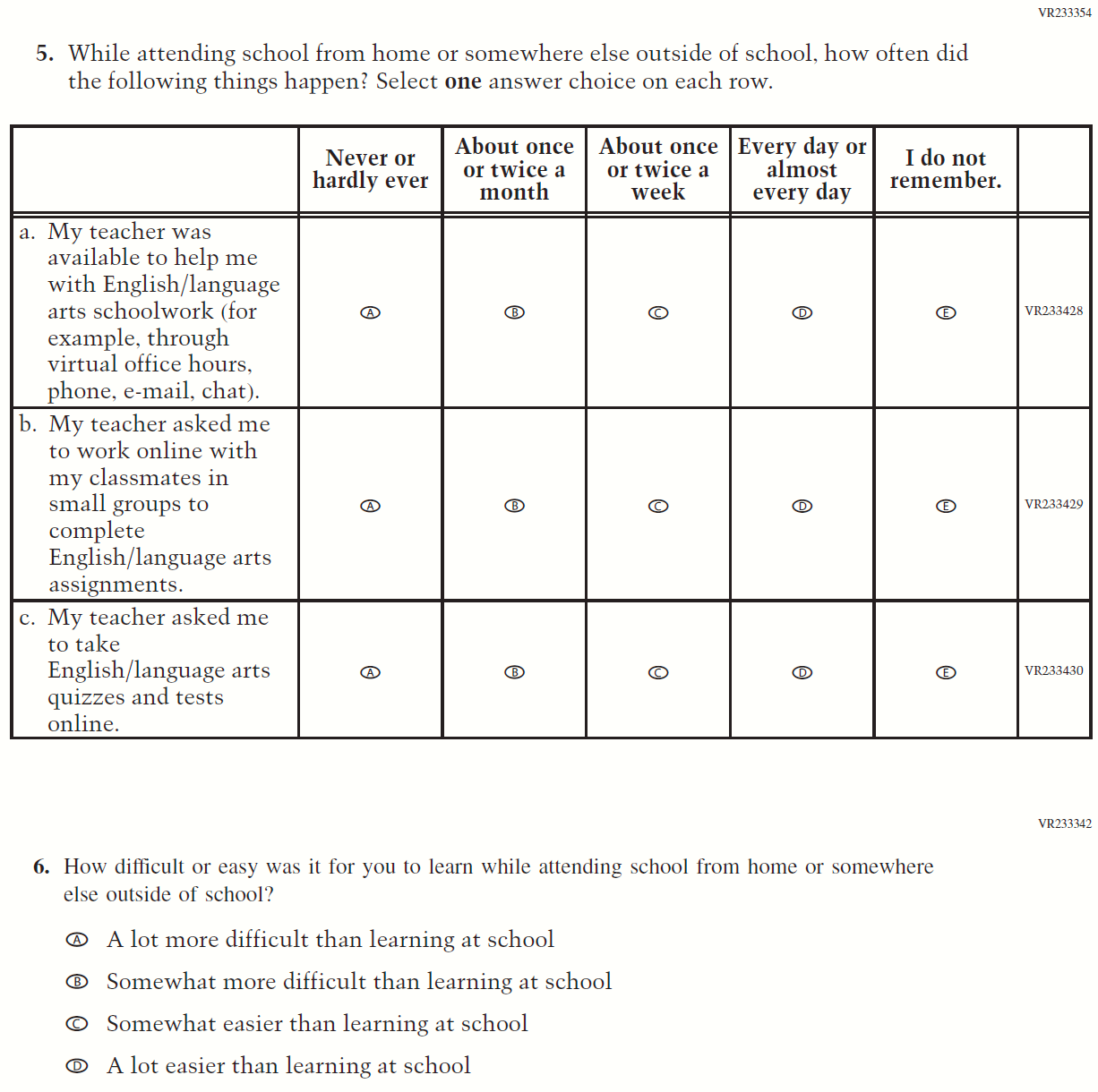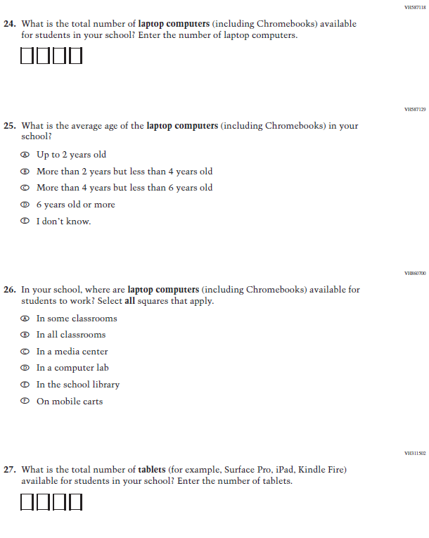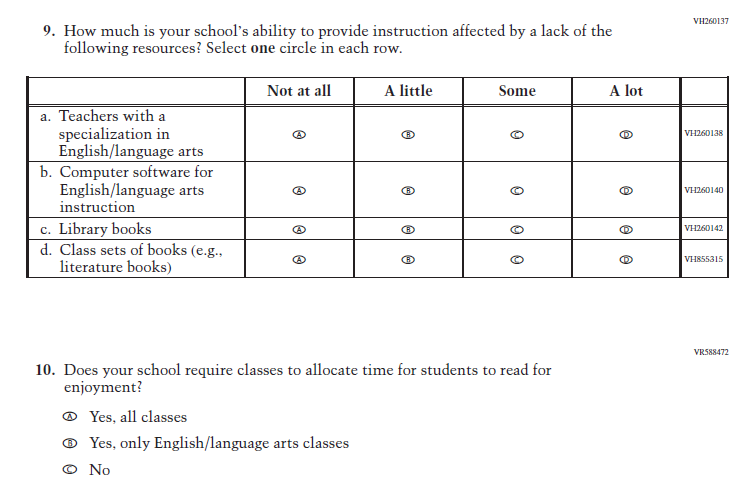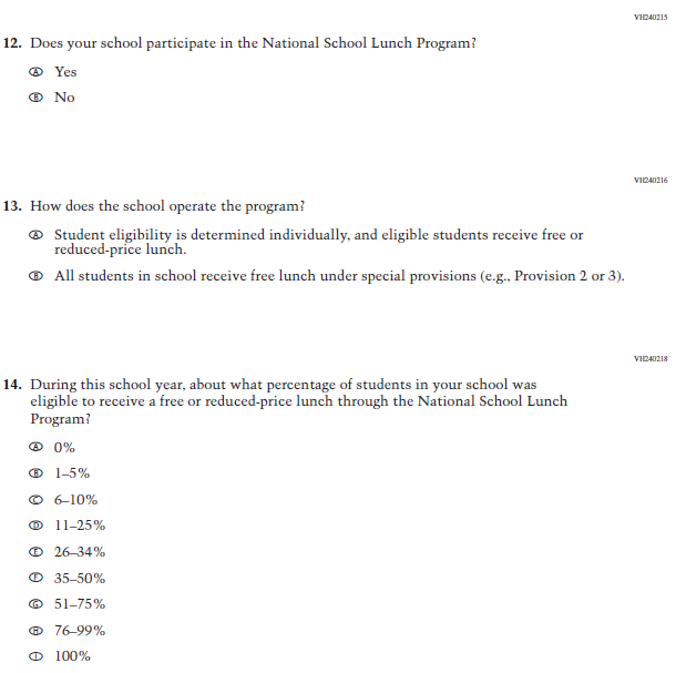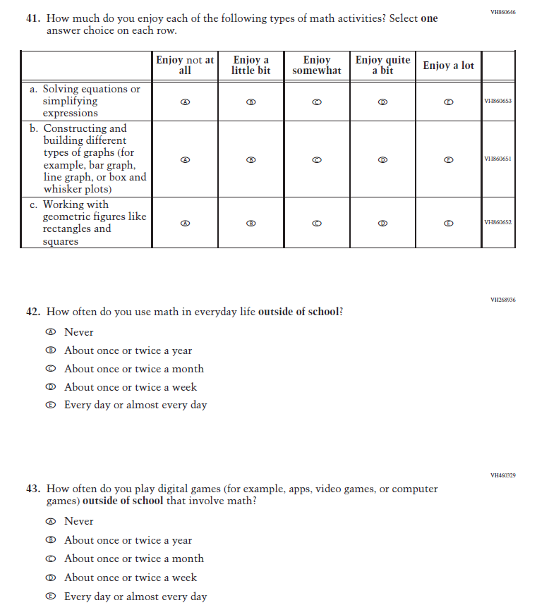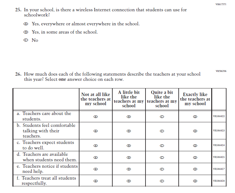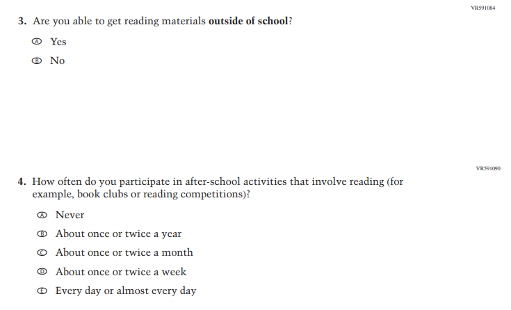 This Appendix F provides the library of possible items to be used in the NAEP 2026 questionnaires. Non-substantive wording changes to the questionnaire items (based on ongoing and future cognitive and pilot testing results), if any will be made, along with the final selection of which items will be used in the final versions of the NAEP 2026 questionnaires, will be provided as outlined below. The number of items selected for each type of respondent will be appropriate to the allocated time (as indicated in the Supporting Statement Part A section A.12).