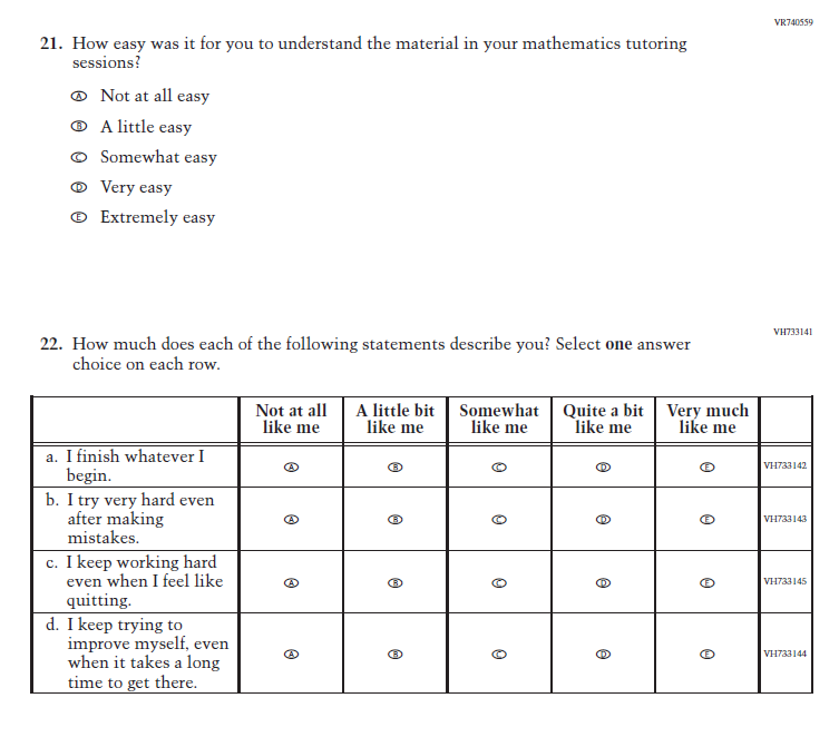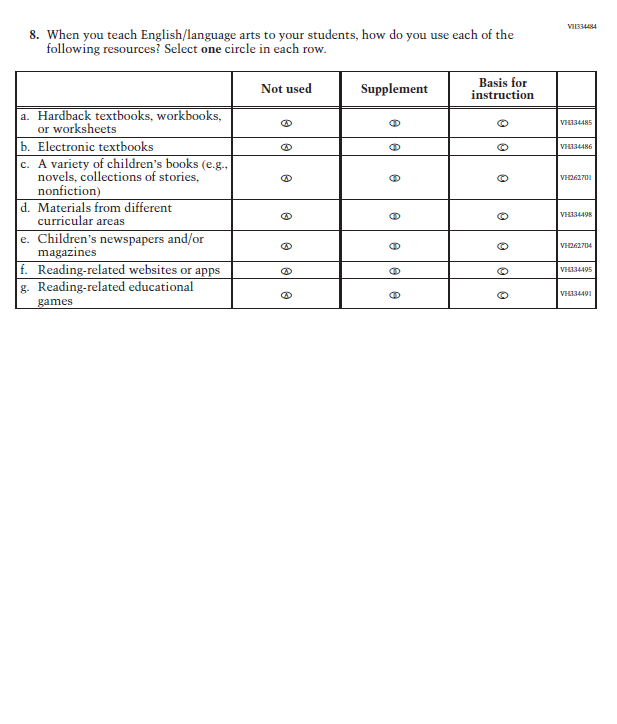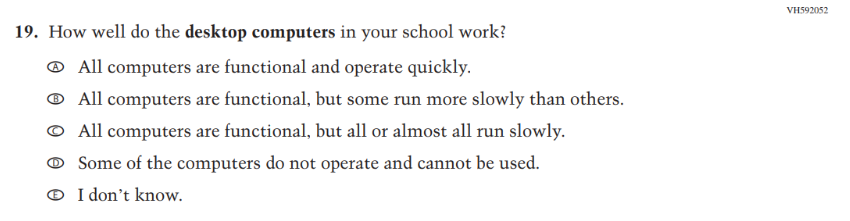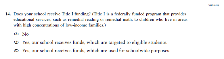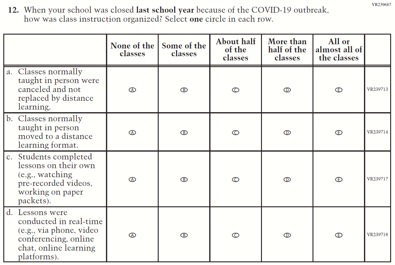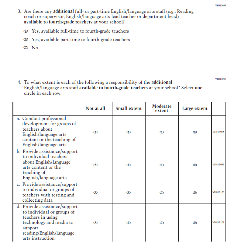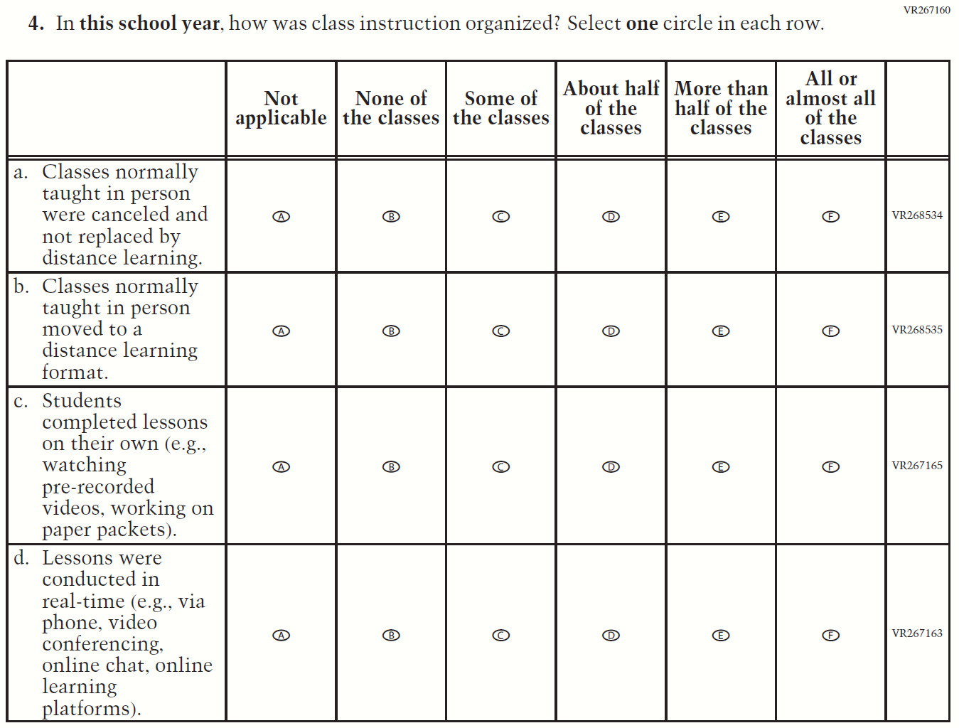 This Appendix F provides the library of possible items to be used in the NAEP 2026 questionnaires. Non-substantive wording changes to the questionnaire items (based on ongoing and future cognitive and pilot testing results), if any will be made, along with the final selection of which items will be used in the final versions of the NAEP 2026 questionnaires, will be provided as outlined below. The number of items selected for each type of respondent will be appropriate to the allocated time (as indicated in the Supporting Statement Part A section A.12).