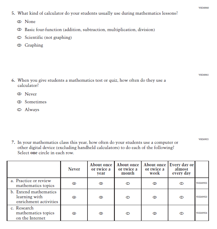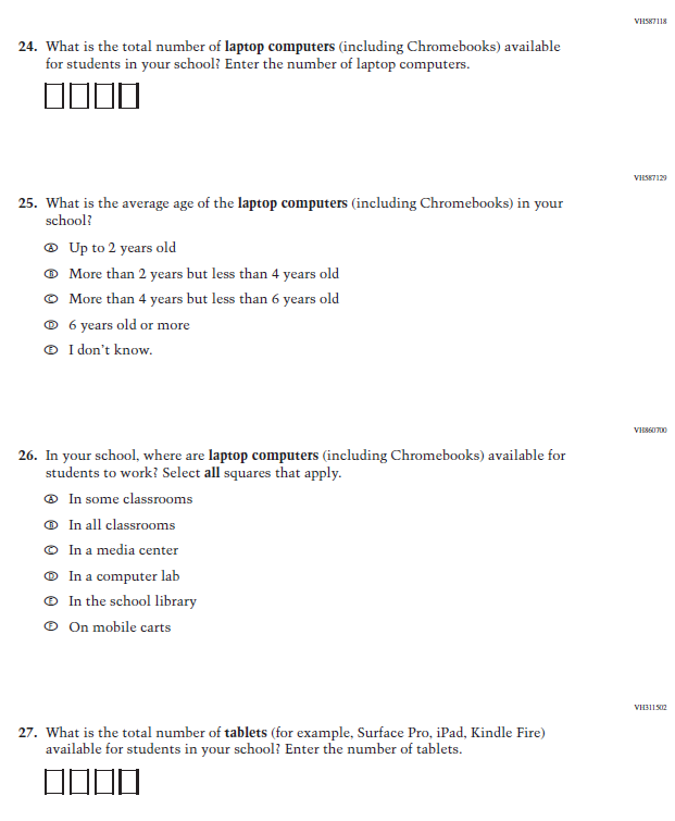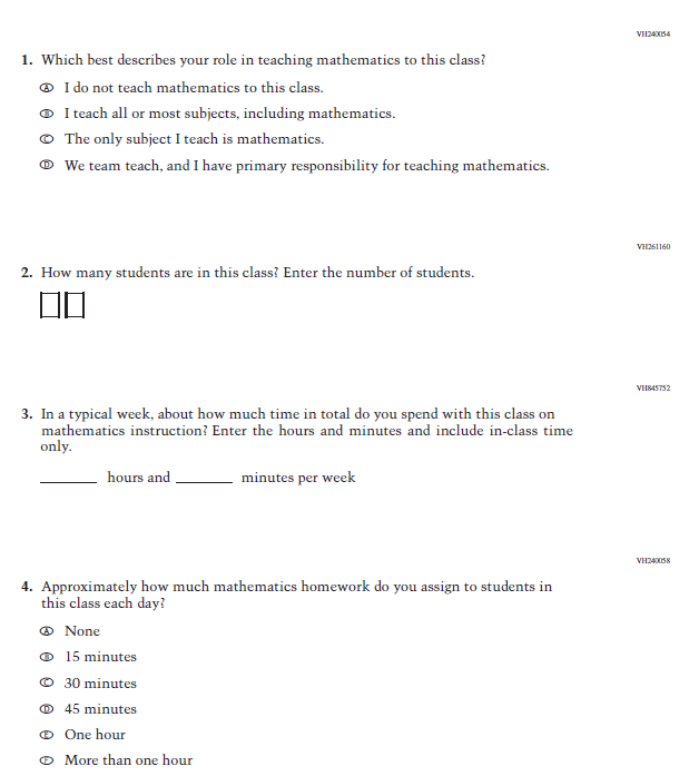 Appendix F includes the 2024 NAEP core and subject specific survey questionnaires for students, teachers, and school administrators, which were approved in October 2023 (OMB# 1850-0928 v.31). The final survey questionnaires for 2026 will be included in Appendices J1, J2, J3 and J-S in either Amendment #1 (Spring 2025), Amendment #2 (August/September 2025), or some combination of both Amendments. Updates to the race and ethnicity items, in compliance with the updated SPD 15 standards, will be included in Amendments #1 or #2. System login screens will also be updated in upcoming Amendments to the Clearance Package.