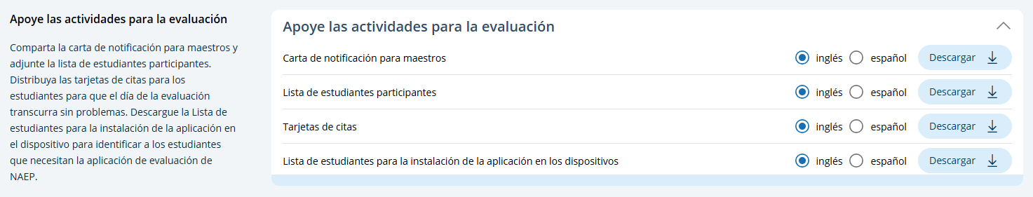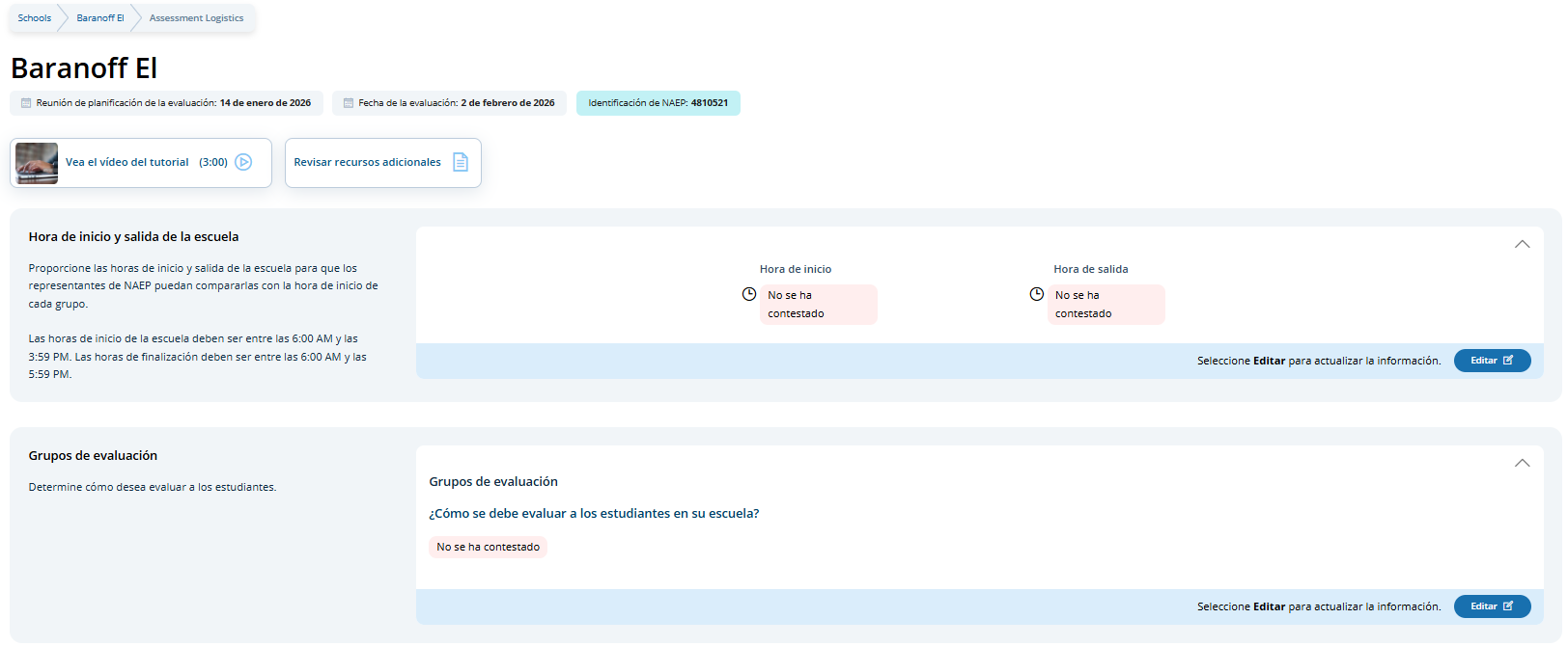 NCES estima que el tiempo necesario para completar esta recopilación de información es de un promedio de 270 minutos para las escuelas que no proporcionan información sobre la muestra de estudiantes, o 390 minutos para las escuelas que proporcionan información sobre la muestra de estudiantes manualmente, además de 10 minutos adicionales por cada estudiante identificado como EI o AE, incluyendo el tiempo para leer las instrucciones, buscar los recursos de datos existentes, recopilar los datos necesarios y completar y revisar la recopilación de información. Esta recopilación voluntaria de información ha sido revisada y aprobada por la OMB (número de control 1850-0928). Si tiene cualquier comentario acerca de la exactitud del tiempo estimado, sugerencias para mejorar esta recopilación o cualquier comentario o preocupación acerca del estatus de la presentación individual de su formulario, escriba a: National Assessment of Educational Progress (NAEP), National Center for Education Statistics (NCES), Lyndon Baines Johnson Department of Education Building, 400 Maryland Ave., SW, 5th floor, Washington, DC 20202, o envíe un correo electrónico a: nces.information.collections@ed.gov. Cuando haya terminado su trabajo o si necesita parar y regresar después para terminarlo, por favor SALGA del sistema a fin de mantener la seguridad de la información contenida en el Sistema de Administración de la Evaluación.