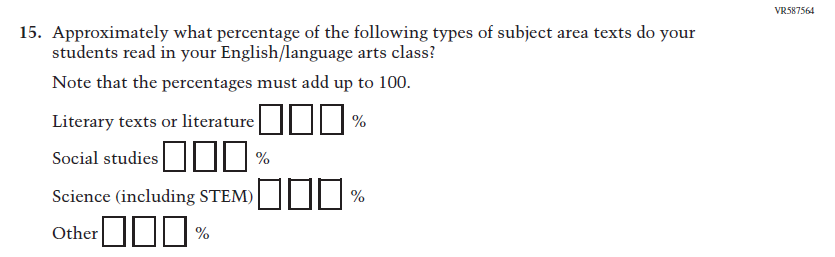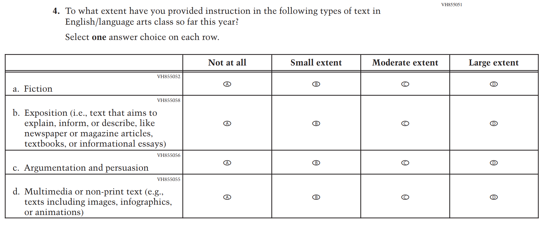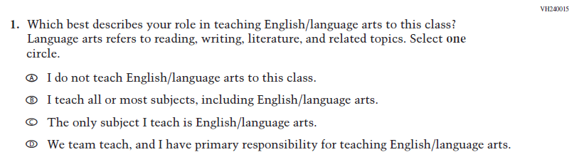 For 2026, we have aligned Inline Directions in Teacher and School Items with the Directions currently used in Student Items. Subitems a, b, c, and d were revised for clarity and subitem h was developed to measure content aligned with the new Reading framework. |