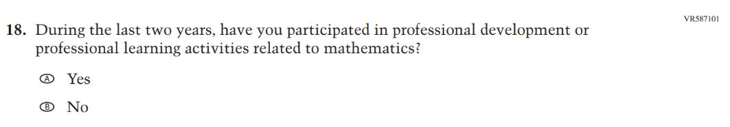 For 2026, we have aligned Inline Directions in Teacher and School Items with the Directions currently used in Student Items. The Item stem was revised for clarity, six subitems were kept, and new subitems were developed to measure content aligned with the new Mathematics framework. |
