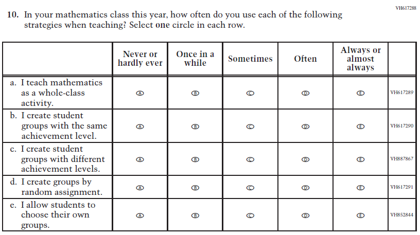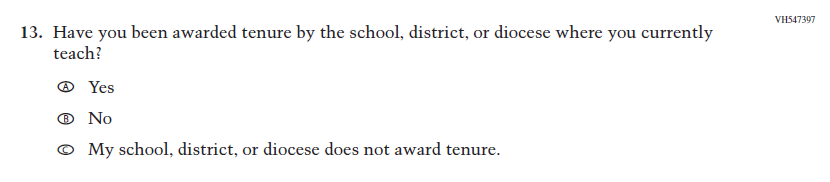 Appendix J2 provides the teacher survey questionnaires that will be administered in 2026, and any changes to the items from the 2024 administration are reflected in summary tables. Please note, some of the numbers of the items may be missing or out of order in these printed versions. This will be corrected in the platform view.