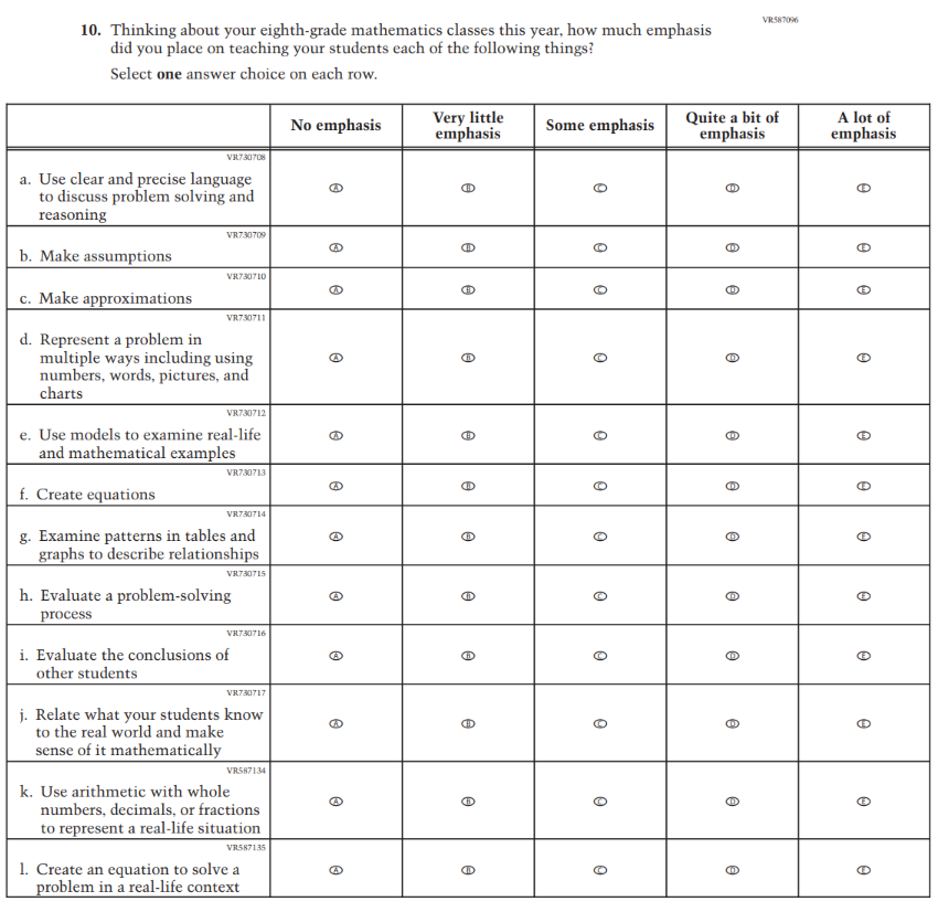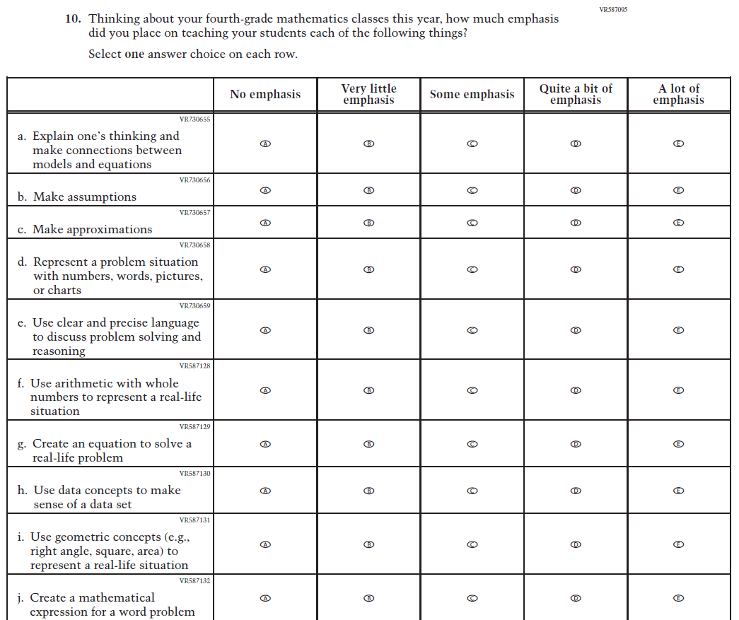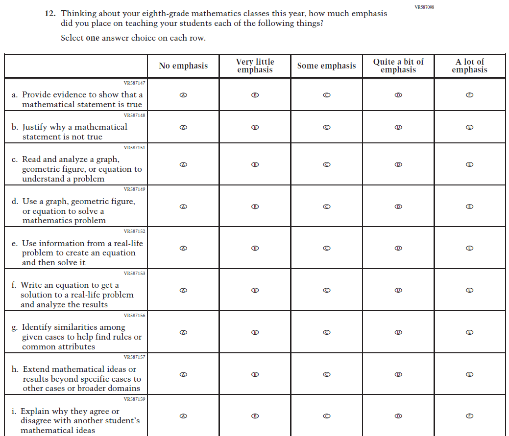 For 2026, we have aligned Inline Directions in Teacher and School Items with the Directions currently used in Student Items. The Item stem was revised for clarity and subitems k-p were developed to measure content aligned with the new Mathematics framework. |