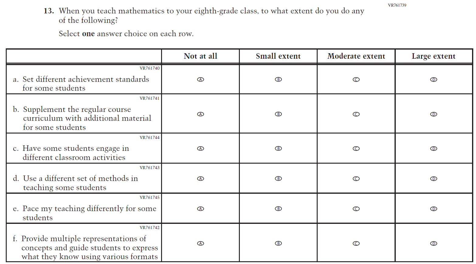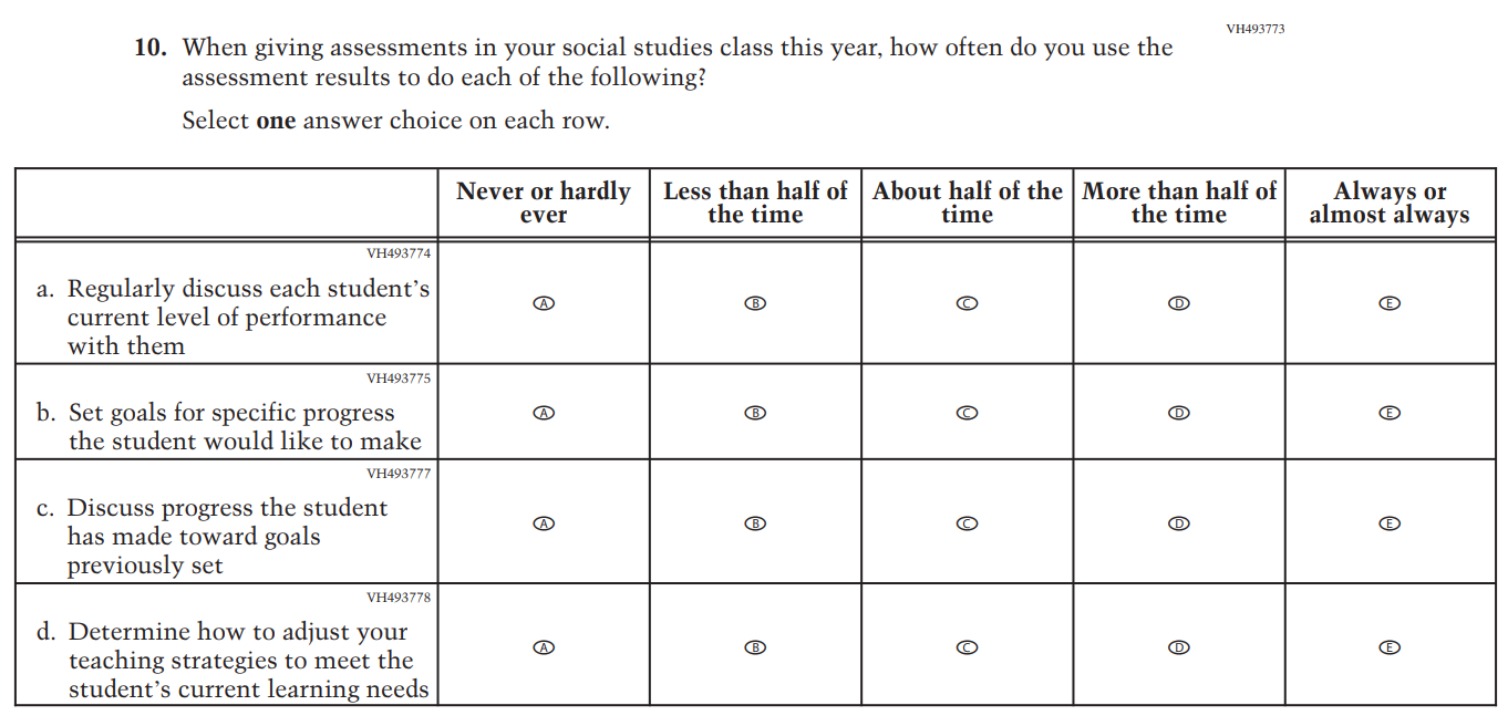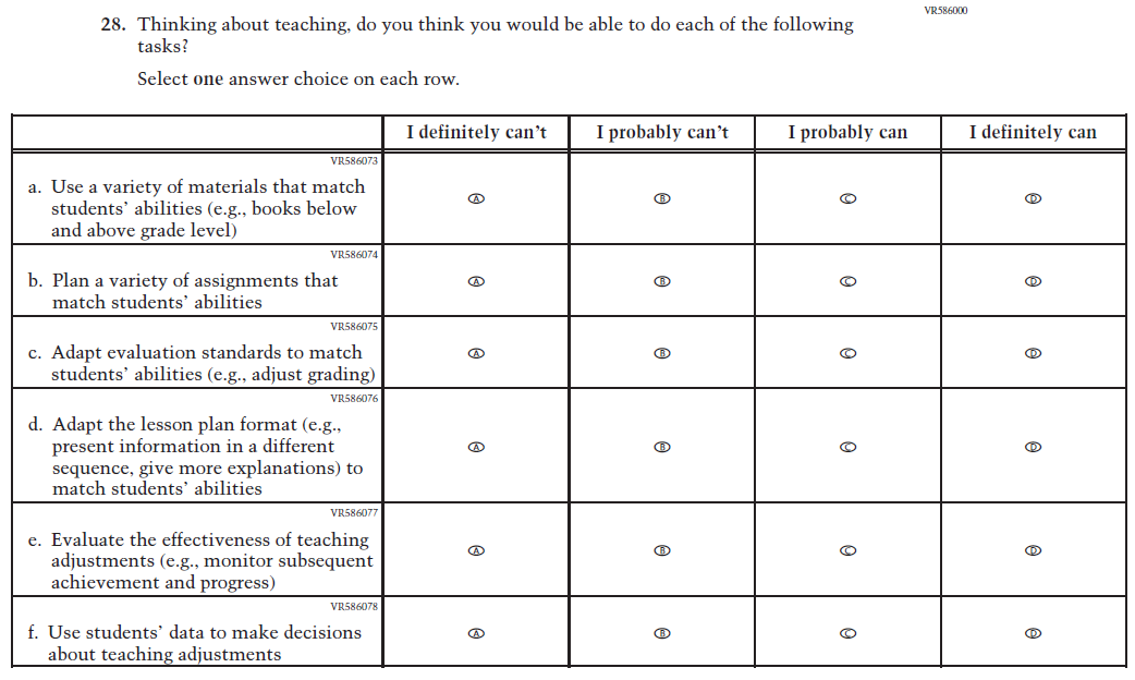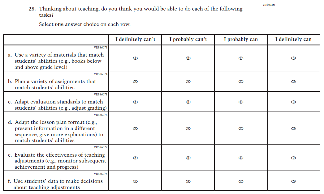 For 2026, we have aligned Inline Directions in Teacher and School Items with the Directions currently used in Student Items. The Item stem was revised for clarity and subItem d was dropped to reduce questionnaire length. |