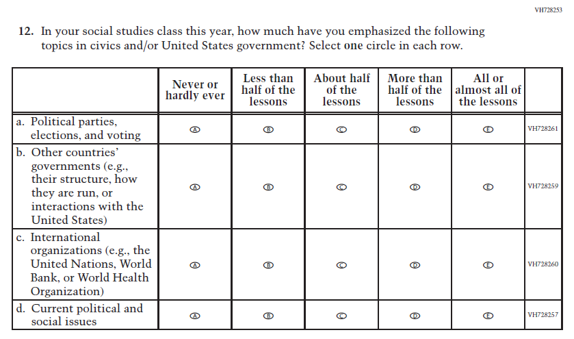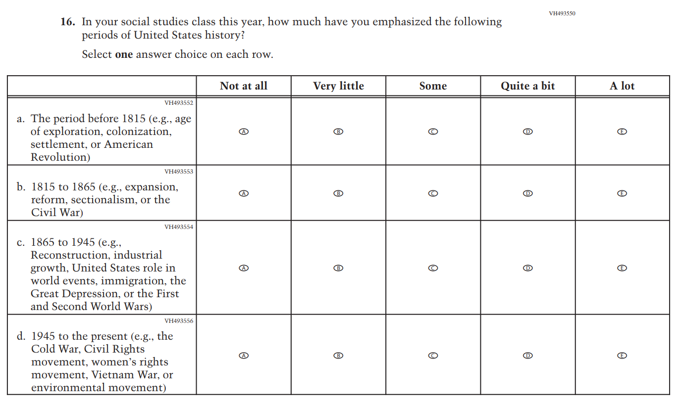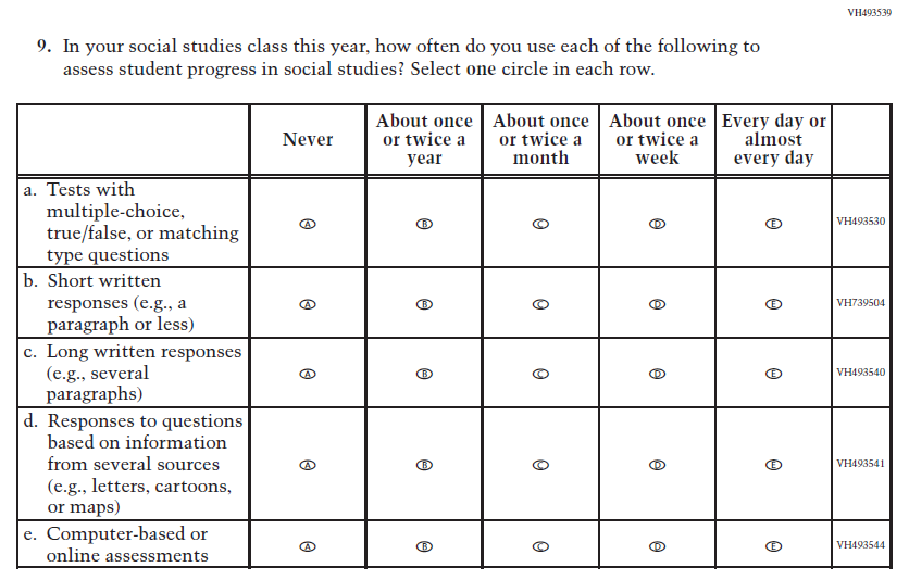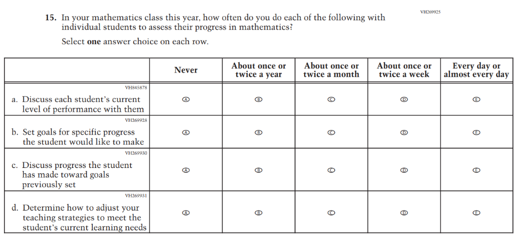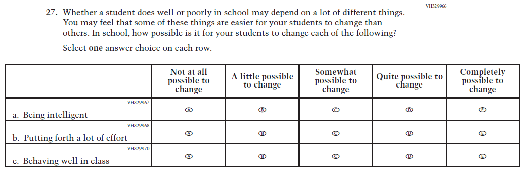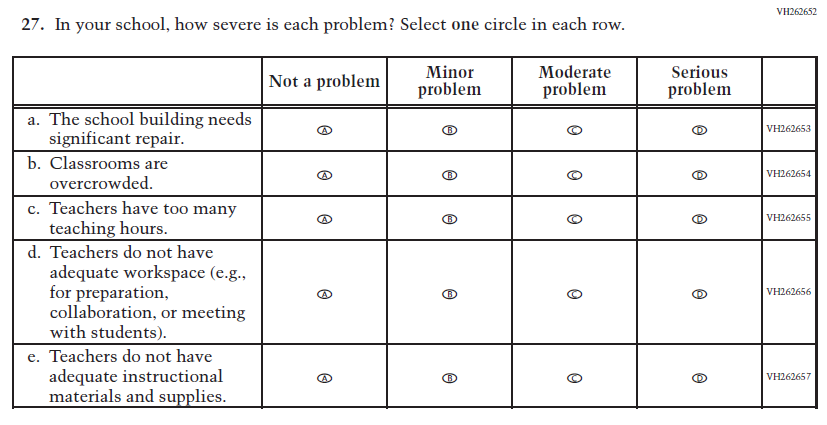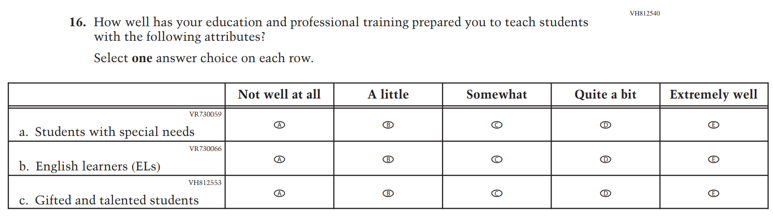 For 2026, we have aligned Inline Directions in Teacher and School Items with the Directions currently used in Student Items. The Item stem was revised for clarity and subItem d was dropped to reduce questionnaire length. |