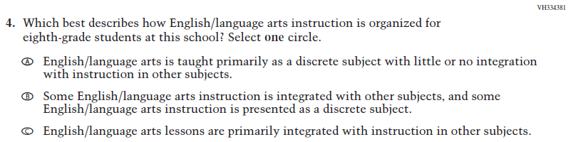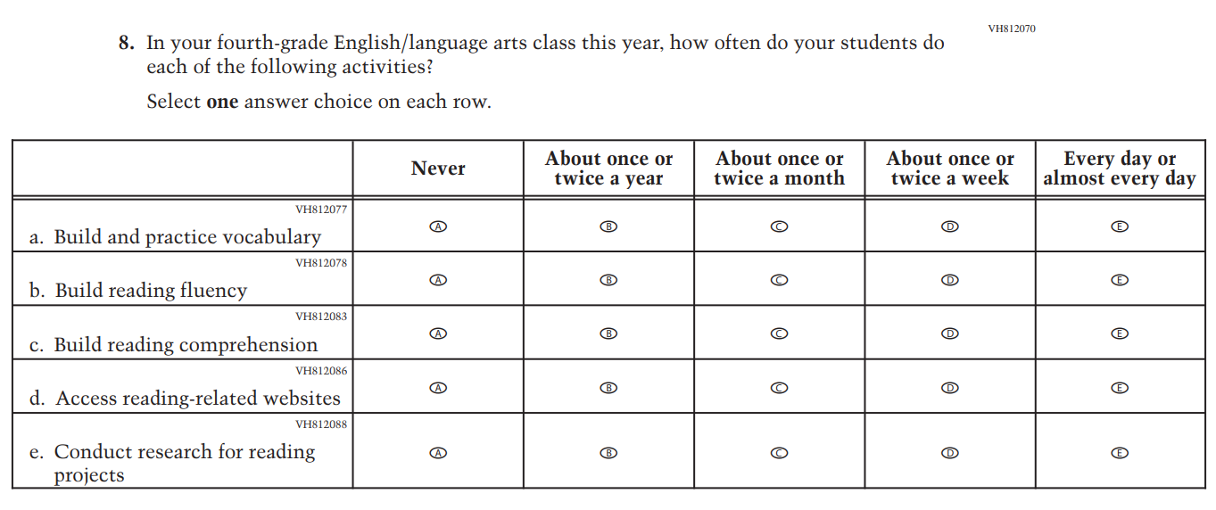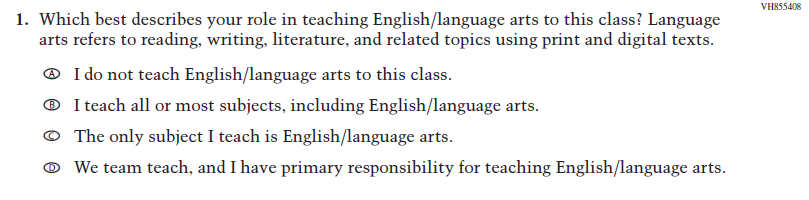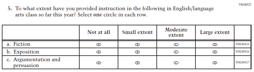 For 2026, we have aligned Inline Directions in Teacher and School Items with the Directions currently used in Student Items. The Item stem and subitem c were revised for clarity, and subitems f, g, and h were developed to measure content aligned with the new Reading framework. |