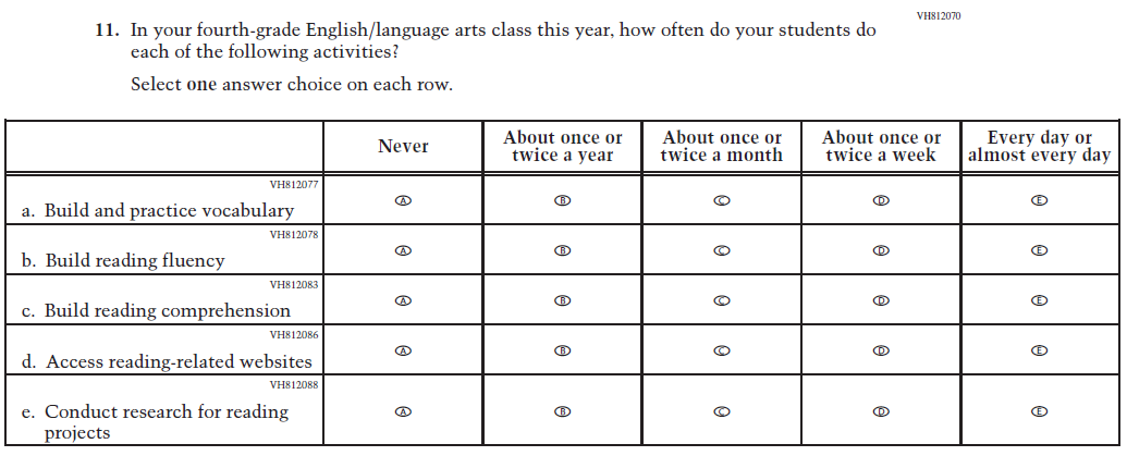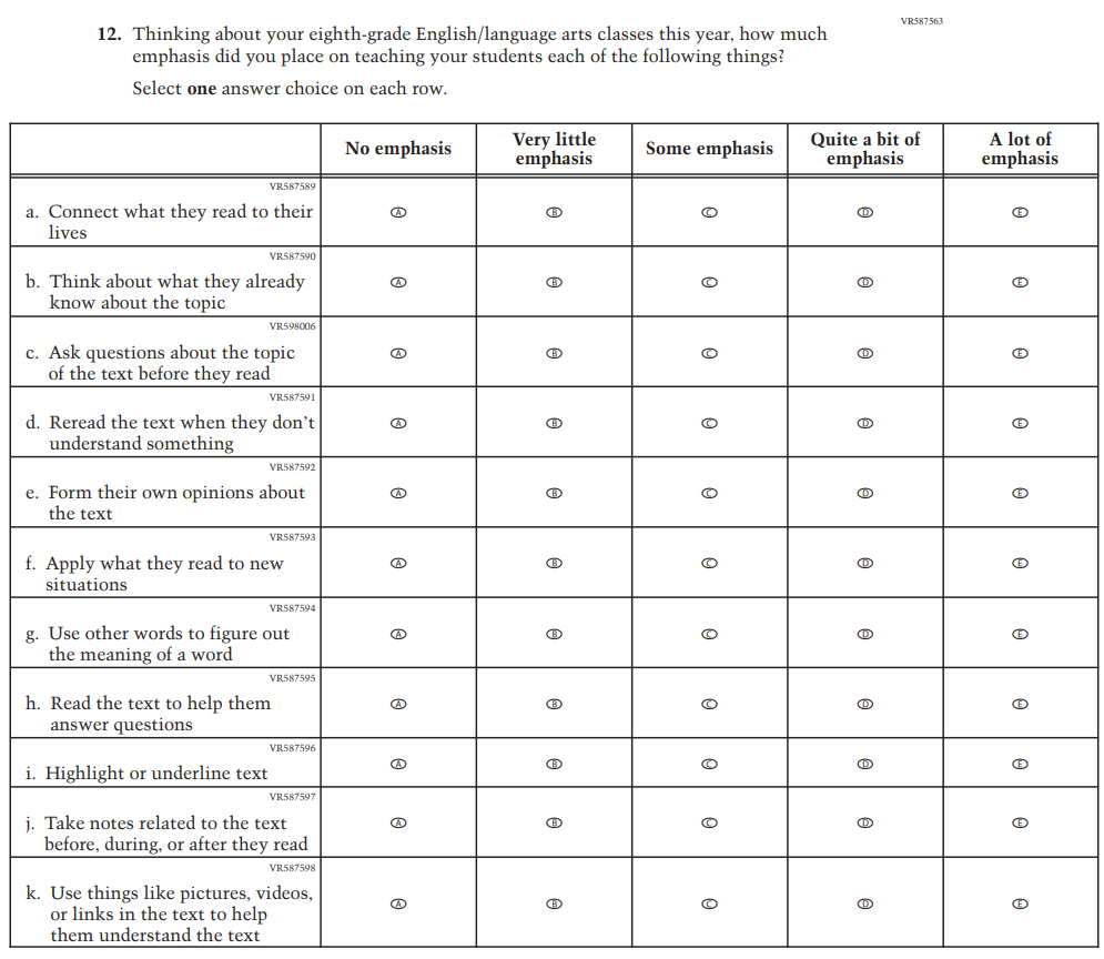 For 2026, we have aligned Inline Directions in Teacher and School Items with the Directions currently used in Student Items. Subitems c, f, g, and h were revised for clarity, and subitems i, j, and k were developed to measure content aligned with the new Reading framework. |